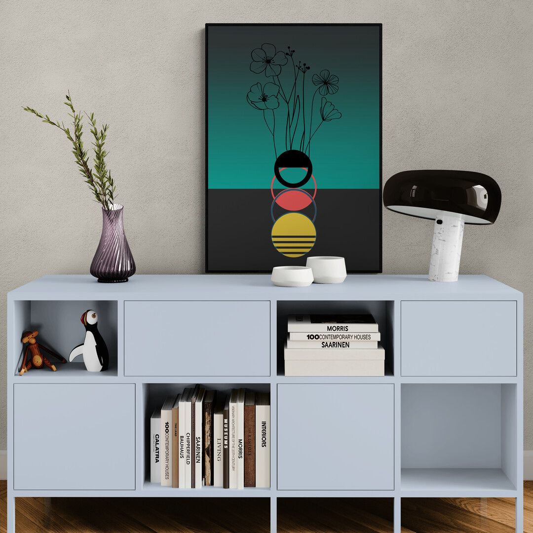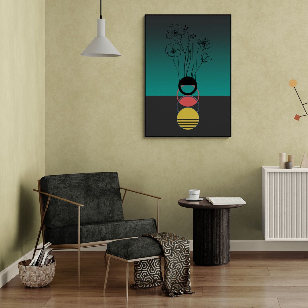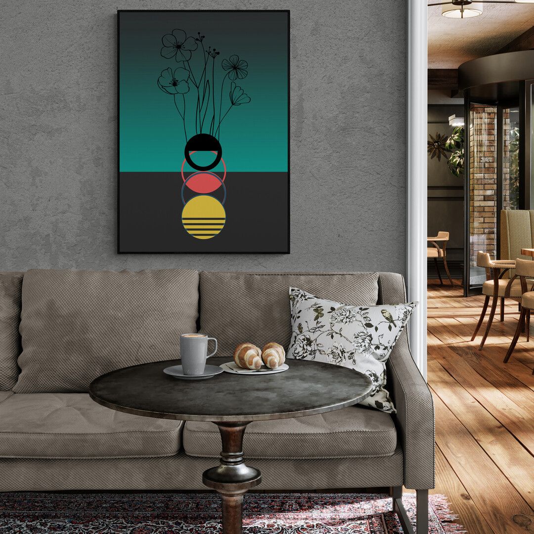 Kompozycja jest czytelna i świadoma. Plakat przyciąga uwagę od pierwszego spojrzenia, ale nie dominuje wnętrza — z czasem zaczyna działać poprzez rytm, proporcje i zmieniające się światło.