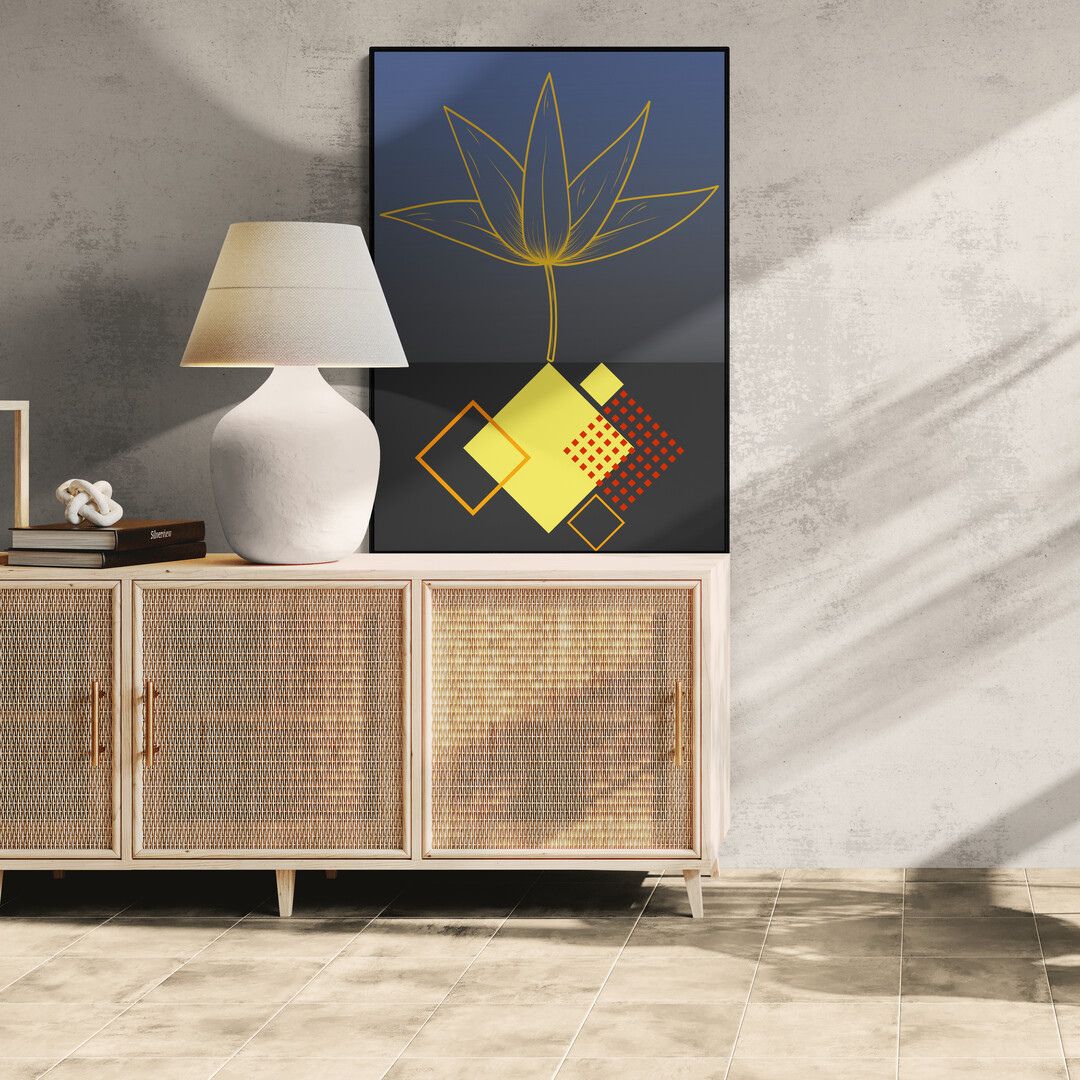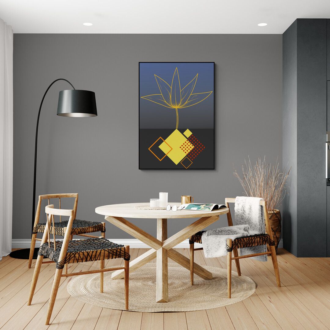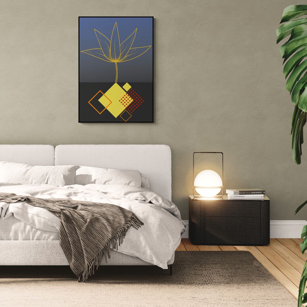 Kompozycja jest czytelna i świadoma. Plakat przyciąga uwagę od pierwszego spojrzenia, ale nie dominuje wnętrza — z czasem zaczyna działać poprzez rytm, proporcje i zmieniające się światło.