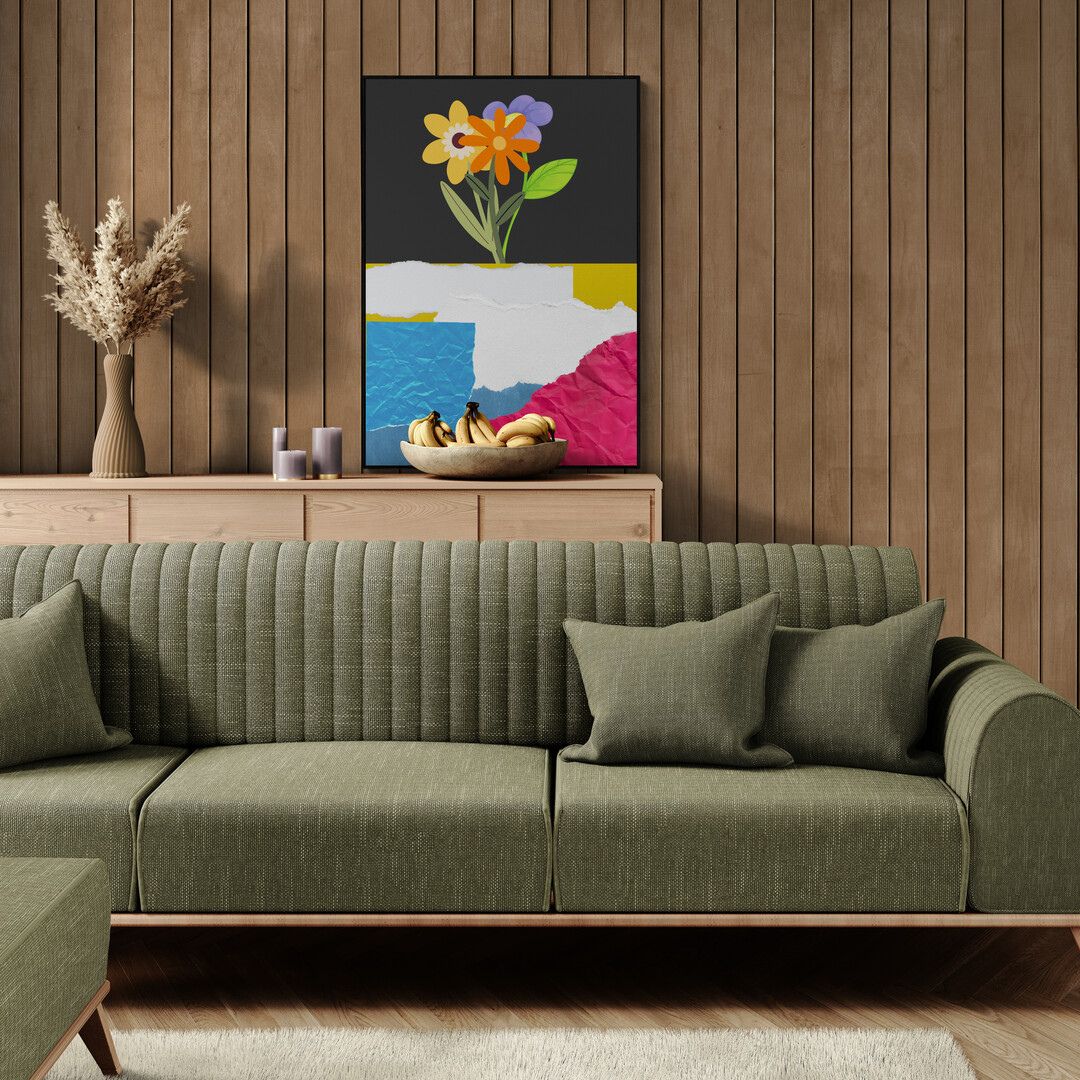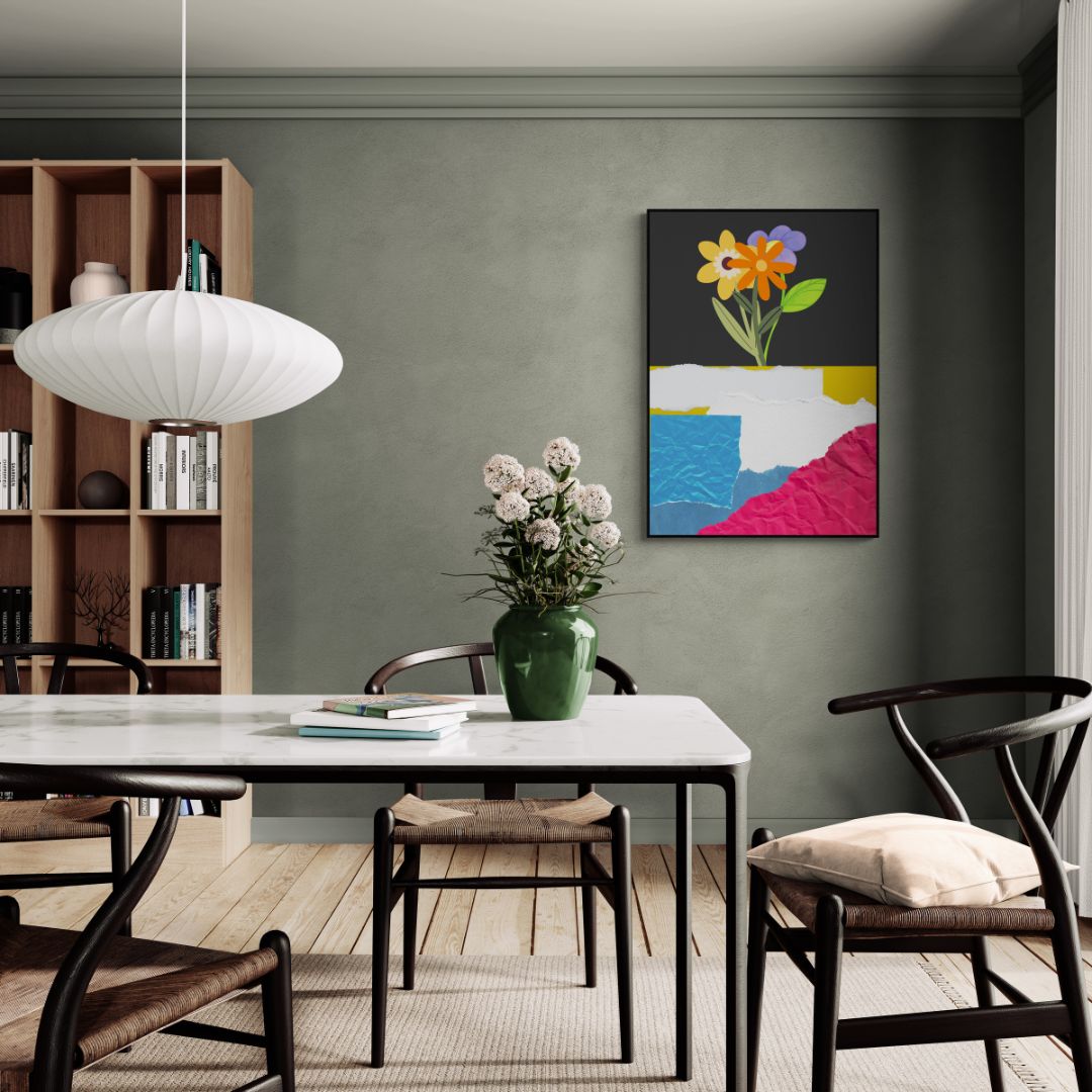 Kompozycja jest czytelna i świadoma. Plakat przyciąga uwagę od pierwszego spojrzenia, ale nie dominuje wnętrza — z czasem zaczyna działać poprzez rytm, proporcje i zmieniające się światło.