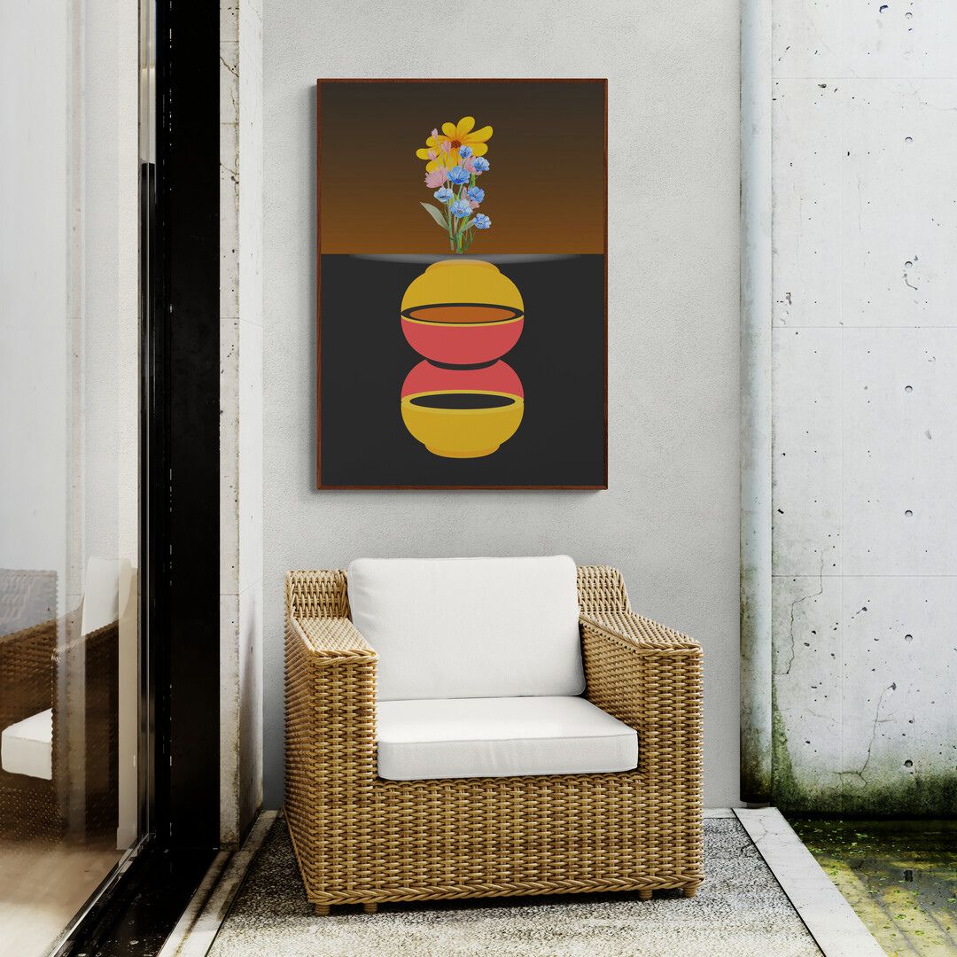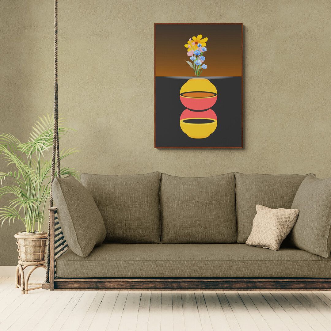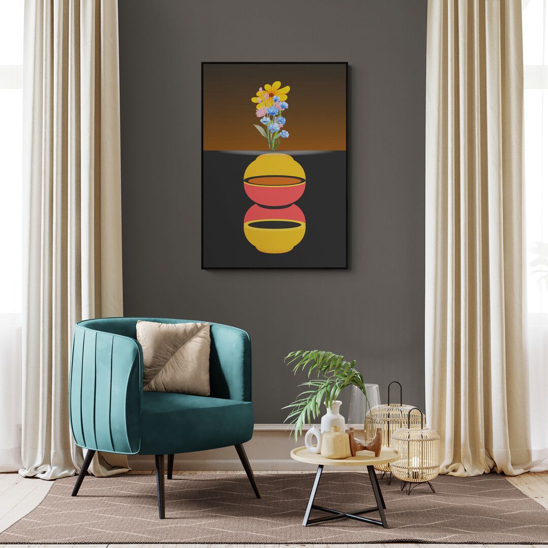 Kompozycja jest czytelna i świadoma. Plakat przyciąga uwagę od pierwszego spojrzenia, ale nie dominuje wnętrza — z czasem zaczyna działać poprzez rytm, proporcje i zmieniające się światło.