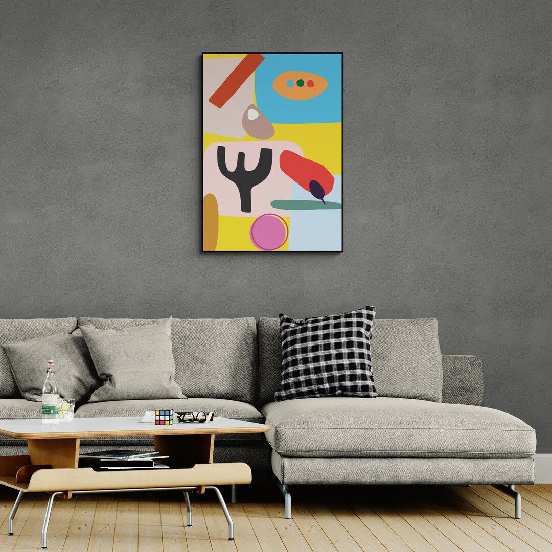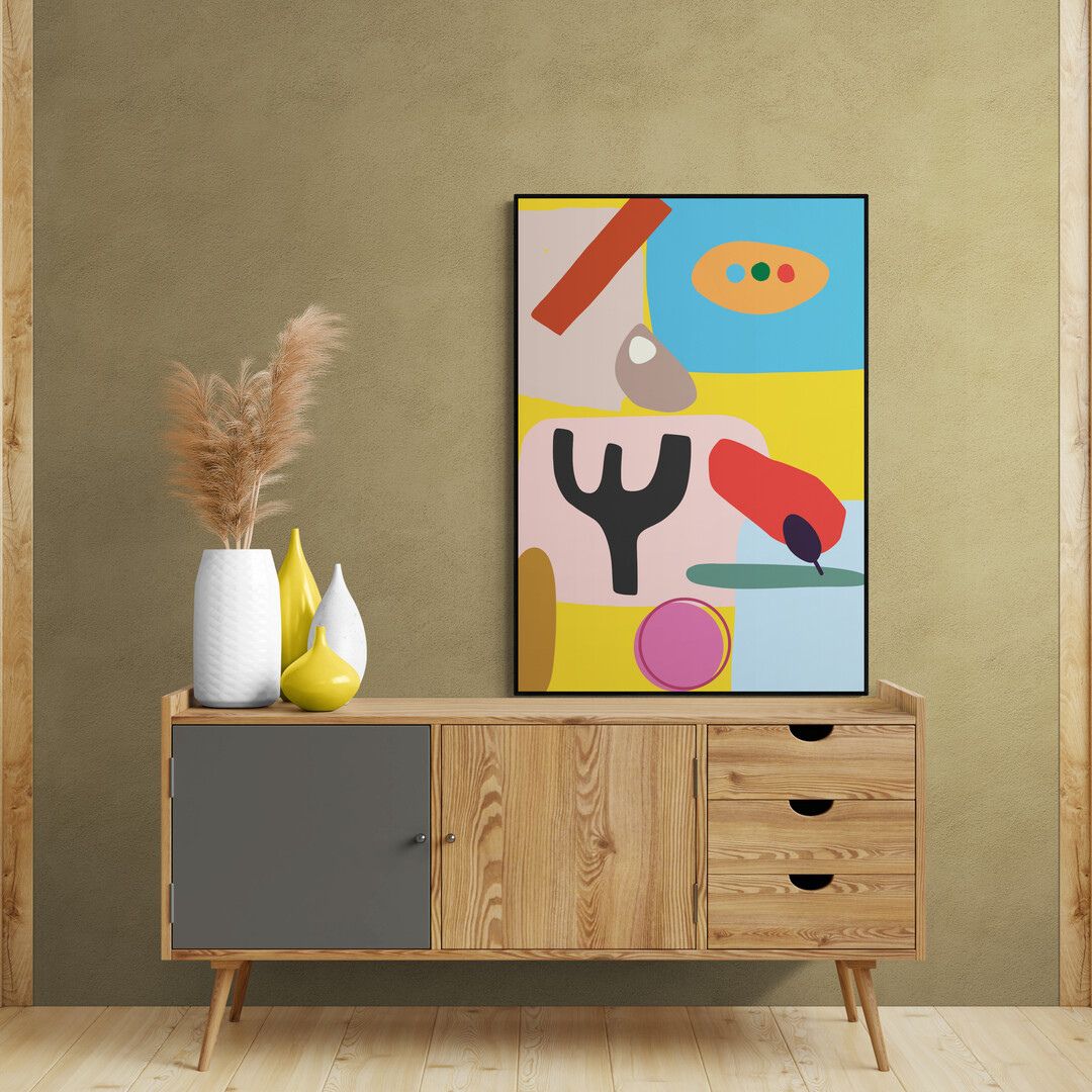Abstrakcyjne kształty i kontrasty kolorystyczne sprawiają, że plakat przyciąga uwagę, ale nie dominuje — staje się częścią codziennego rytmu miejsca.