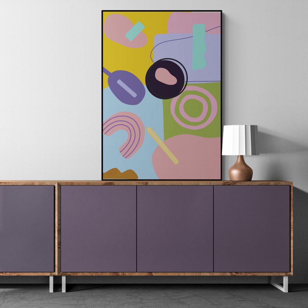 Abstrakcyjne kształty i kontrasty kolorystyczne sprawiają, że plakat przyciąga uwagę, ale nie dominuje — staje się częścią codziennego rytmu miejsca.