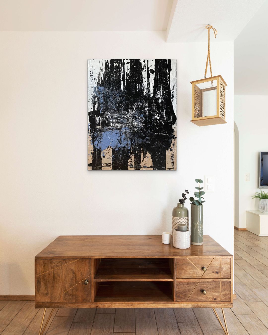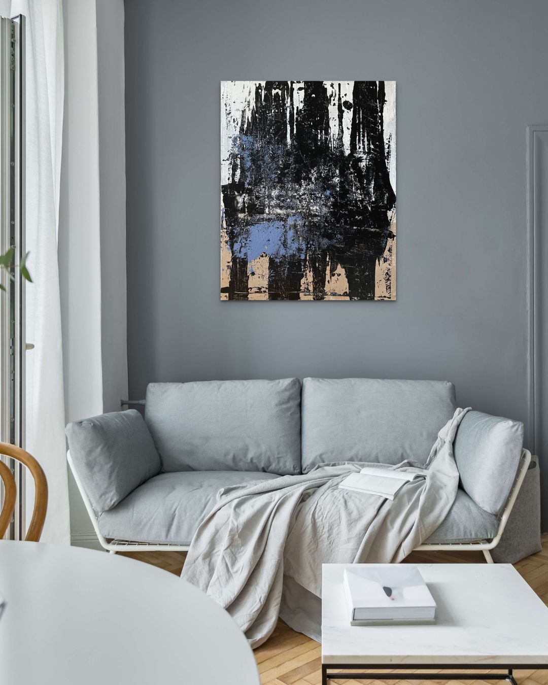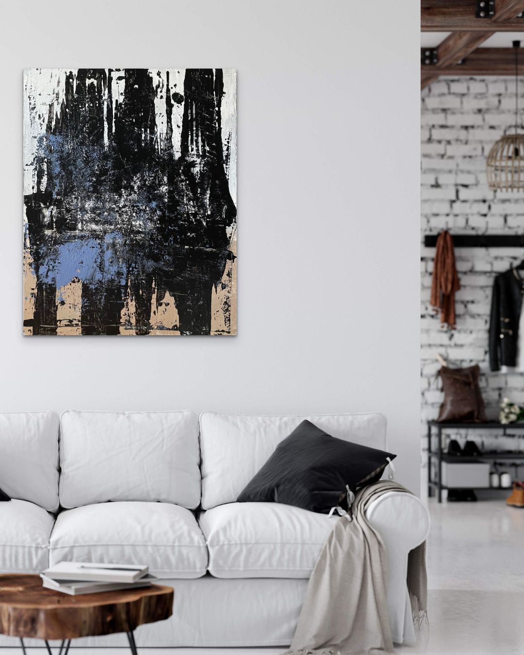 Matowa czerń, biel i niebieskie kolory przyczyniają się do jego atrakcyjności. Świetnie prezentuje się we wnętrzach. Obraz jest idealnym dodatkiem do każdego współczesnego domu.